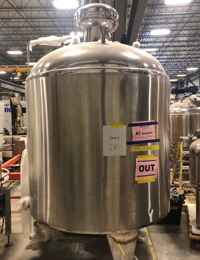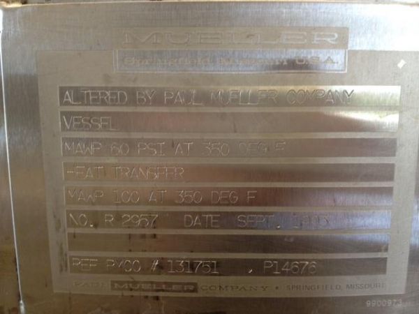 Good Condition 2800L Mueller "f" tank. Pharmaceutical Grade 316 stainless inner shell, Dual 304 jackets, 2" insulation, 304 stainless cladding. Tank MAWP - 60psi @ 350F Jacket MAW - 100psi @ 350F The tank bottom actuated valve was updated/replaced by mueller in 1993 with Saunders 70v61-315-p4 tbv have pneumatic tank bottom valves if automation is required Weight 2650.00 lbs Manufactured: 1983 Location: Michigan, USA