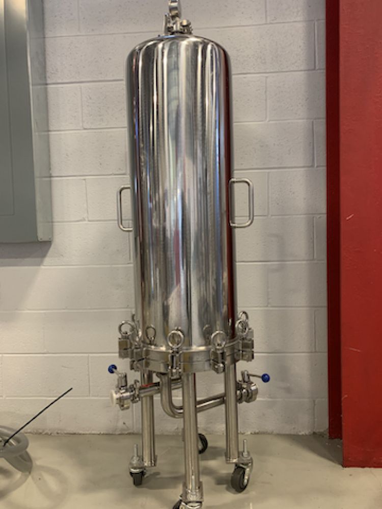The design of the Lenticular housings are on standing 4 legs (it has casters, but these were added but can be removed), closure by stainless steel bolts, sealing by silicone gasket, flat gasket style adapter for modules. There are several benefits of using Lenticular housings. Filtration without product losses due to an enclosed design. The filter requires less space than a standard plate filter due to its vertical design. The houses are simple to load and break down — no need for wetting and re-tightening. The housings can be loaded with as few as one filter model if using the appropriate center post. Also, the filter modules can be back flushed and reused multiple times when using back-flushable modules. The housing can hold 3 filter modules high, 12" diameter (there are no plates, it uses filter modules; we also have fitler modules at 3 microns) it has been used during filtration of our cold brew coffee from 2017 to 2019 filter media was never re-used, so the housing is in great condition. Weight: approx 190 lbs Manufactured by Scott Laboratories in 2017 Location: Ontario